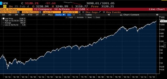 Wszyscy, którzy boją się strat na giełdzie spowodowanych koronawirusem, powinni uspokoić się, patrząc na historyczny wykres S&P 500, pokazany od lat 20. I zdaniem analityków nie należy się przejmować poniedziałkowymi spadkami. Indeks ma szanse na odbicie wraz z poprawą nastrojów inwestorów. A to informacje o możliwej szczepionce, a to wzrost zachorowań we Włoszech spowodowany ponoć niedopełnieniem procedur w jednym ze szpitali.