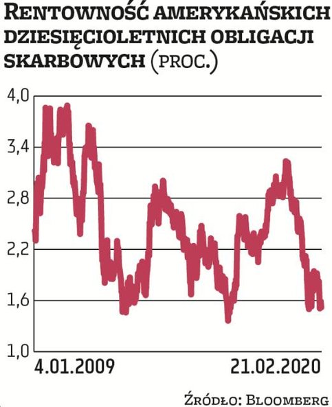 Główne zwiastuny korekty to bardzo mocny rynek złota, co w połączeniu z umacniającym się dolarem jest oczywistym sygnałem awersji do ryzyka. Złoto jest najdroższe od siedmiu lat, indeks dolara jest powyżej lokalnego szczytu z listopada ubiegłego roku, a rentowność amerykańskich dziesięcioletnich obligacji skarbowych ponownie pikuje w okolice 1,5 proc. Co więcej, wszystko to dzieje się w warunkach braku nowych negatywnych zjawisk i informacji, co tym bardziej uwiarygadnia tezę o nadchodzącej korekcie na rynku akcji. Pogorszenie nastrojów widoczne jest nie tylko w Stanach Zjednoczonych, ale także na naszym kontynencie i w Japonii. DAX zniżkował do czwartku o 0,6 proc., mimo że inwestorzy od dawna ignorują fatalne dane napływające z niemieckiej gospodarki. Większą makroekonomiczną wrażliwością wykazali się w ostatnich dniach gracze z Tokio, gdzie – po publikacji danych o znaczącym, sięgającym 6,3 proc. spadku PKB oraz pogorszeniu się sytuacji w handlu zagranicznym i w zamówieniach w przemyśle – Nikkei zniżkował o 1,3 proc. Na tym tle szczególnie groźnie nie wygląda 1,5-proc. spadek indeksu rynków wschodzących, który korygował silne zwyżki z poprzednich dwóch tygodni. Gdyby wypreparować z MSCI Emerging Markets wynik chińskiego parkietu, sytuacja byłaby dużo gorsza. Shanghai Composite wzrósł bowiem o ponad 4 proc., niwelując z niewielką nawiązką straty powstałe w wyniku dramatycznych wieści o epidemii koronawirusa. Niewątpliwie znaczący udział w procesie „nawracania" rynku akcji mają działania Ludowego Banku Chin, pompującego pieniądze, które zamiast do firm trafiają na giełdę. O sile tego zjawiska świadczy fakt, że główny indeks chińskiej giełdy od dołka z pierwszych dni lutego podskoczył o ponad 10 proc. mimo przesądzonego już znaczącego pogorszenia się koniunktury gospodarczej w tym kraju.