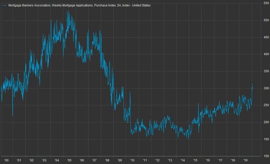 Przygotowywany przez Mortgage Bankers Association (amerykańskie Stowarzyszenie Banków Hipotecznych) indeks wniosków o kredyty hipoteczne rozpoczął ten rok od szybkich wzrostów. Tylko jeden tydzień stycznia był spadkowy, i to lekko – 1,2 proc. W tygodniu zakończonym 24 stycznia wzrósł już jednak o 7,2 proc. Przebił już najwyższe poziomy roku 2009 –jest wyżej od wszystkich notowań lat 2009-2019. W porównaniu z wartościami ubiegłorocznymi jest już wyżej o niemal 60 proc.