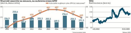 Inwestorzy handlujący akcjami na GPW z niską płynnością borykają się od dawna. Umorzenia jednostek uczestnictwa TFI w latach 2018–2019, w sporym stopniu wywołane aferą GetBacku, jeszcze wzmocniły to zjawisko, podobnie jak mechanizm suwaka w OFE. Wartość obrotów sesyjnych na głównym rynku wyniosła w 2019 r. 191 mld zł wobec 204 mld i 236 mld zł w latach odpowiednio 2018 i 2017. Słaby był też 2016 r. z obrotami rzędu 189 mld zł. Z drugiej strony warto pamiętać, że ubywało też spółek – na koniec 2019 r. było ich 449 wobec 465 i 482 w dwóch poprzednich latach. Problem obrotów najmocniej dotknął spółek średniej wielkości, ale przede wszystkim tych małych.