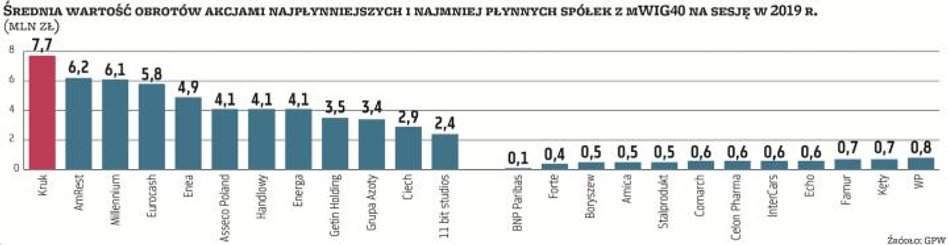 Na GPW przeciętny inwestor indywidualny, mający dobrze zdywersyfikowany portfel, może śmiało inwestować bez obaw o płynność we wszystkie spółki z WIG20 i mWIG40. W tym pierwszym indeksie średnia wartość obrotów na sesję w 2019 r. wynosiła od 8,1 mln zł (Tauron) po 91 mln zł (PKO BP), w drugim zaś od 0,4 mln zł (Forte) do 7,7 mln zł (Kruk) – wyjątkiem w mWIG40 jest BNP Paribas Bank Polska, którego akcjami średnie obroty na sesję w 2019 r. wyniosły tylko 100 tys. zł. Bank jest przykładem, że warto przyjrzeć się free floatowi (mierzącemu procentowy udział akcji w wolnym obrocie i wartość tego pakietu), bo tu często znajduje się odpowiedź, czy i dlaczego firma jest mało płynna. W indeksie sWIG80 znajdziemy firmy ze stosunkowo sporą wartością obrotów na sesję, jak Neuca, Rafako czy Polimex (po 0,6 mln zł), oraz te już mało płynne, jak Lentex, Sanok czy PGS Software (po 100 tys. zł).