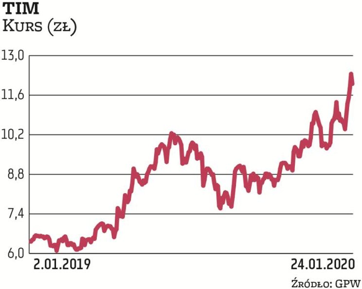 Mimo zmiennych nastrojów na rynku w 2019 r. stałym zainteresowaniem inwestorów cieszyły się akcje TIMu, co wyniosło notowania spółki do poziomów niewidzianych od kilku lat. Stały za tym mocne argumenty w postaci poprawiających się wyników. Dystrybutor elektrotechniki ma za sobą rekordowy rok pod względem wypracowanych przychodów. – Spodziewam się dobrych wyników za 2019 (poprawa marż) i 2020 r. (pozytywny wpływ wyników firmy 3LP). Kupowanie akcji przez władze spółki to również ważny sygnał dla inwestorów – zwraca uwagę Sobiesław Kozłowski, dyrektor departamentu analiz doradztwa w Noble Securities.