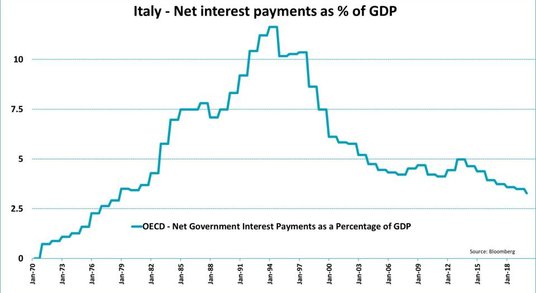 Dług publiczny Włoch jest nominalnie największy w Unii Europejskiej(przekroczył już 2,5 biliona euro). W 2018 roku wynosił 134,8 proc.PKB i w 2019 przekroczył 135 proc. PKB. Mimo że Komisja Europejska apelowała o korekty budżetu, Włochy wykluczały taka możliwość. Tymczasem KE przyjęła dokument stwierdzający, że w przypadku Włoch „procedura nadmiernego deficytu z uwagi na dług jest uzasadniona". Na razie jednak zamieszanie trwa, a koalicja Ruchu Pięciu Gwiazd i Partii Demokratycznej nadal pracuje nad projektem budżetu. Spory dotyczą np. wprowadzenia dwóch podatków: od słodzonych napojów i od jednorazowych plastikowych opakowań.