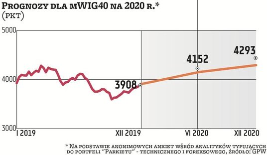 Zacznijmy od WIG20. Ze wskazań ekspertów wynika, że pierwsze półrocze dla tego segmentu może być trudne. Tylko 50 proc. prognoz jest wyżej niż zamknięcie ostatniej sesji 2019 r. (poziom 2150 pkt). W ujęciu uśrednionym indeks dużych spółek melduje się na koniec czerwca na poziomie 2200 pkt, co uznać za wielki wyczyn raczej trudno. Zwłaszcza jeśli weźmiemy pod uwagę fakt, że w czwartek po południu WIG20 rósł do 2189 pkt, a więc znalazł się 11 pkt od prognozowanego pułapu.