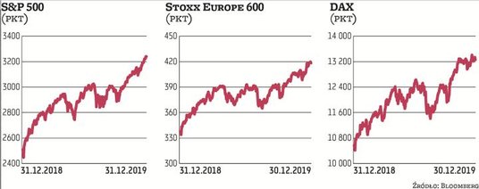 S&P 500 zaczynał 2019 r. na poziomie wynoszącym około 2,5 tys. pkt, a kończył na zbliżonym do 3,2 tys. pkt. Mediana prognoz analityków, zebranych w połowie grudnia przez agencję Bloomberga, mówi, że na koniec 2020 r. powinien on wynosić 3350 pkt. To oznaczałoby wzrost o około 5 proc. Mało imponujący w porównaniu z tymi z ostatnich lat i sugerujący sporą korektę w ciągu roku. Ale jednak przewidywania wciąż mówią o wzroście. Największym optymistą jest John Stoltzfus, strateg Oppenheimera, który spodziewa się wzrostu tego indeksu do końca 2020 r. do 3500 pkt, czyli zwyżki o 9 proc. Największy pesymista, Mike Wilson z Morgan Stanley, przewiduje spadek S&P 500 do 3000 pkt, czyli o 6 proc. Mniej optymizmu widać w prognozach strategów dotyczących niemieckiego indeksu DAX. O ile w grudniu wskaźnik ten dochodził do 13200 pkt, to mediana przewidywań mówi, że zakończy on 2020 r. na poziomie 13500 pkt. Kolejne rekordy zostaną więc pobite, ale roczny wzrost wyniesie mniej niż 1 proc. Najwięksi optymiści – analitycy Bank of America – spodziewają się zwyżki o prawie 9 proc., do 14600 pkt. Najwięksi pesymiści mówią o spadku do 12000 pkt, czyli o ponad 10 proc. Dosyć słabo wyglądają natomiast prognozy dla paneuropejskiego indeksu Stoxx Europe 600. Mediana mówi o jego spadku do końca roku o około 1 proc., najbardziej optymistyczna prognoza o zwyżce o 4,6 proc., a najbardziej pesymistyczna o spadku o 9 proc.