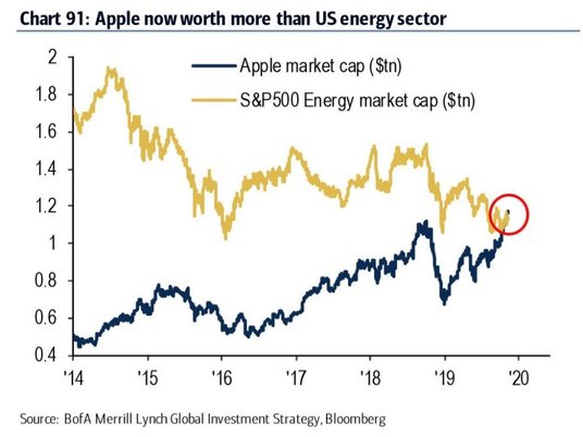 Rynkowa wartość Apple sięgnęła na koniec 2019 roku niemal 1,2 biliona dolarów, podczas gdy w przypadku indeksu S@P 500 Energy spadła poniżej tej kwoty. Kurs akcji producenta iPhone'ów wynosił ostatnio 293,5 dolarów. Co więcej, analityk Apple Gene Munster uważa Apple za najlepszą firmę technologiczną w kraju, pokonując takie serwisy jak Facebook, Amazon, Netflix i Google.