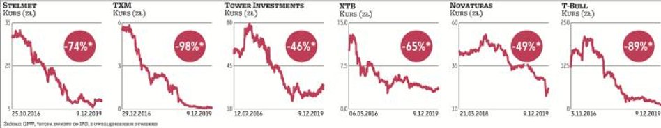 Dla inwestorów szczególnie kontrowersyjne są sytuacje, gdy po IPO notowania pikują w dół, a firma po paru latach jest ściągana z giełdy znacznie poniżej ceny z IPO. Takich przykładów było ostatnio na giełdzie kilka – teraz Stelmet może zostać wycofany z GPW, przynosząc inwestorom ponad 70-proc. stratę. Wcześniej na minusie byli akcjonariusze m.in. Avii AM Leasing (21 proc.), Macrologica (39 proc.), Olympica i Duonu (po 55 proc.) czy InPostu (62 proc.).
