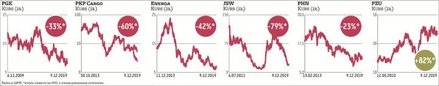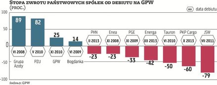 Okazuje się, że biorąc pod uwagę państwowe spółki, ta sytuacja nie jest niestety wyjątkowa. Spośród 11 debiutów takich firm od 2008 r. aż siedem przynosi do tej pory ujemne stopy zwrotu (uwzględniając wypłacone dywidendy). W dużej mierze to zasługa właśnie firm energetycznych, wszystkie cztery są na minusie. Enea, która zadebiutowała w listopadzie 2008 r., jest 23 proc. na minusie (bez dywidend przecena wyniosłaby 43 proc.). Rok później na giełdę weszła PGE, która przynosi 33-proc. stratę (65-proc. bez dywidend). W czerwcu 2010 r. na giełdzie pojawił się Tauron, którego stopa zwrotu to prawie -50 proc. (dywidendy obniżyły stratę o 18 pkt proc.). Najgorzej wypadła JSW, która od lipca 2011 r. przyniosła blisko 80-proc. stratę mimo wypłaty trzech dywidend (na kolejne wypłaty trudno liczyć).