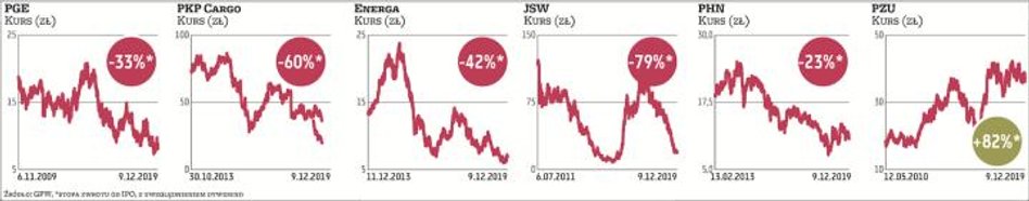 Słabo wypadły też ostatni dwaj państwowi debiutanci – PKP Cargo i Polski Holding Nieruchomości – którzy weszli na rynek odpowiednio w październiku i lutym 2013 r. Stopy zwrotu wynoszą odpowiednio -60 proc. i -23 proc.