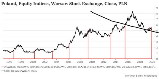 Teza postawiona w poprzednim miesiącu – „Teraz pora na Misie" – zdaje się potwierdzać. Względna siła sWIG80 do WIG20 wzrosła do najwyższego poziomu od 15 miesięcy i że taki sygnał pojawiał w każdym z siedmiu ostatnich cykli Kitchina, za każdym razem poprzedzając dalsze wielomiesięczne umocnienie indeksu akcji małych spółek względem WIG20.