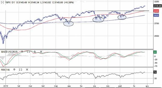 Jeśli natomiast uda się podbić stopę zwrotu do więcej niż 29,6 proc., będzie to najlepszy rezultat od 1997 r. To pokazuje, że Wall Street ma się bardzo dobrze. Na 12 ostatnich miesięcy tylko dwa – maj i sierpień – przyniosły spadek tytułowego indeksu. Co więcej – od lipca notowania regularnie śrubują historyczny rekord. W środowe popołudnie padł najnowszy – 3146,34 pkt. Jeśli spojrzeć na tegoroczny wykres S&P500, to mamy tutaj klasyczny trend wzrostowy, z wyhamowaniem impetu w trzecim kwartale. Warto zwrócić uwagę, że kolejne lokalne dołki są położone coraz wyżej, a notowania od czerwca respektują 200-sesyjną średnią kroczącą. W ujęciu długoterminowym nie widać na razie sygnałów zakończenia hossy. Wręcz przeciwnie – na średnich kroczących z 50 i 200 sesji aktywny jest sygnał kupna wynikający z formacji złotego krzyża i obie średnie zwyżkują. W ujęciu krótszym widać silną, jesienną falę wzrostową, która jak na razie nie została mocno skorygowana. Efekt jest taki, że MACD i RSI są w strefach wykupienia, co zwiększa ryzyko korekty. Zwłaszcza że ten pierwszy wskaźnik już zakręca w dół. Najbliższe wsparcie to 3090 pkt. Niżej silną barierą jest 3030 pkt. PZ