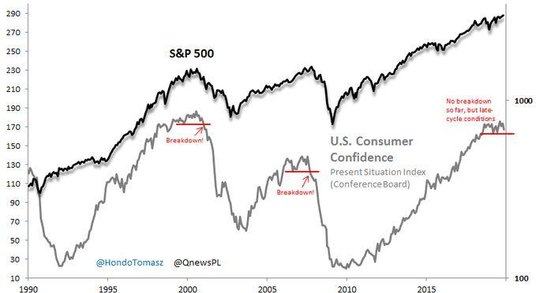 Ekspert zestawił osiągający kolejne rekordy S&P 500 z US Consumer Confidence (wskaźnik nastrojów konsumentów ze Stanów Zjednoczonych), który po dynamicznym wzroście w ostatnich latach obecnie wytracił swoją dynamikę. Jak wskazuje Tomasz Hońdo – poprzez czerwone linie na wykresie – poprzednio tego typu sytuacje zwiastowały nagłe załamanie US Consumer Confidence.