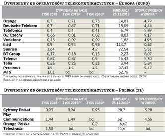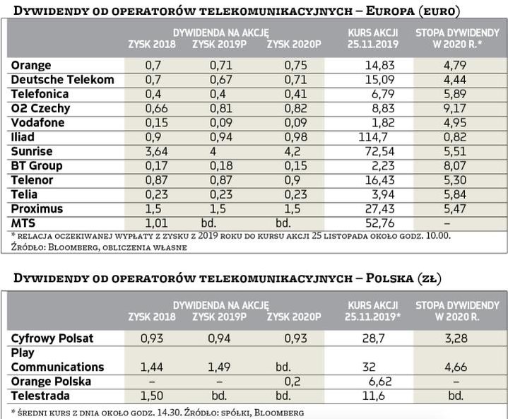 Nieco wyższy zysk oferowały tego dnia akcje Play Communications, plasującego właśnie pierwszą transzę obligacji za 750 mln zł. Plan telekomu mówi, że na dywidendę przeznacza 40–50 proc. wolnych przepływów gotówkowych (FCFE). Średnia prognoz biur maklerskich uczestniczących w ankiecie „Parkietu" wskazuje, że w 2020 roku Play wypłaci inwestorom 1,49 zł na akcję. Przy średnim kursie na poziomie 32 zł stopa dywidendy to około 4,7 proc.