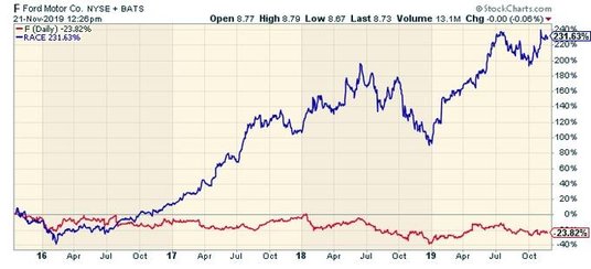 W filmie ostatecznie wygra Ford. Jednak w mediach społecznościowych pojawił się wykres, który przeniósł rywalizację między Fordem i Ferrari na inny wymiar, ten giełdowy. Eddy Elfenbein zestawił akcje tych dwóch firm i sprawdził, które z nich szybciej przemieszczały się na północ w ostatnich czterech latach. Ferrari od czasu debiutu na nowojorskiej giełdzie (październik 2015 r.) dało w tym czasie zarobić dużo ponad 200 proc. A w tym samym okresie, akcje Forda zostały przecenione o blisko 25 proc.