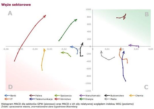 Aby powyższa informacja była bardziej pomocna, tradycyjnie warto przypomnieć, na czym polegają „sektorowe węże". Otóż przedstawiona macierz pozwala na monitorowanie technicznej atrakcyjności poszczególnych branż na GPW. Na grafice „sektorowe węże" obrazują, jak zmieniała się atrakcyjność danego sektora w ciągu ostatnich pięciu tygodni. Jeśli wąż wyjdzie z pola D do pola A, to generowany jest techniczny sygnał kupna dla danego indeksu sektorowego. Z kolei przejście węża z pola A do B oznacza, że dany indeks sektorowy jest relatywnie silniejszy od indeksu WIG, co dodatkowo zwiększa atrakcyjność danego sektora. Przejście węża z pola B do C oznacza, że generowany jest sygnał sprzedaży (sektor ten jest już wykupiony i notowania zaczynają spadać). A przejście węża z pola z C do D oznacza, że spadający sektor jest dodatkowo słabszy niż indeks WIG.