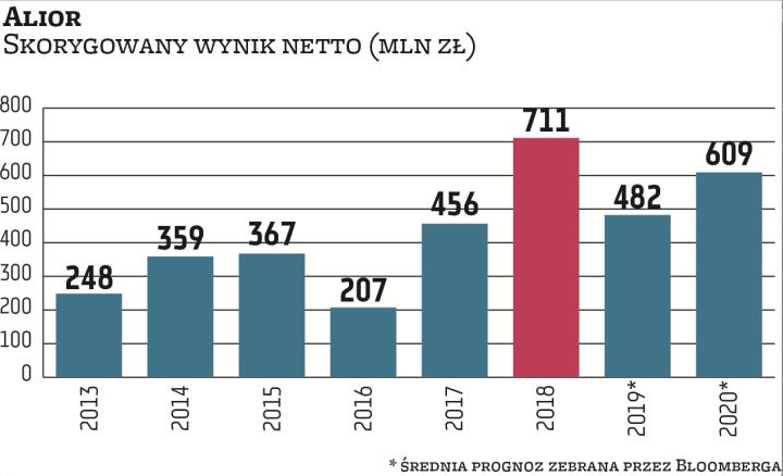 Powodów do zadowolenia nie mają nie tylko akcjonariusze mniejszościowi, których do kupna akcji kusił szybki wzrost aktywów i zysków banku, ale także strategiczny inwestor, czyli PZU, mający teraz 31,9 proc. akcji Aliora. Ubezpieczyciel stał się właścicielem po podpisaniu 30 maja umowy kupna z Carlo Tassarą, czyli włoską grupą inwestorów powiązaną z rodziną Zaleskich, dotyczącej 18,3 mln walorów. Cenę ustalono na 89,25 zł, wtedy na GPW kurs sięgał 92,96 zł (wskaźnik C/WK przy cenie z transakcji wyniósł 1,8 wobec 1,7 średniej dla sektora bankowego), co kosztowało PZU 1,63 mld zł. Kolejne 0,64 mld zł na akcje Aliora ubezpieczyciel wydał, korzystając z prawa poboru latem 2016 r., gdy objął 16,5 mln akcji Aliora (29,2 proc. kapitału) w ramach wtórnej publicznej oferty akcji tego banku (była warta 2,2 mld zł i sfinansowała przejęcie BPH), płacąc po 38,9 zł (prawo poboru w wysokości 12,4 zł zredukowało wycenę pozostałych akcji o tę wartość).