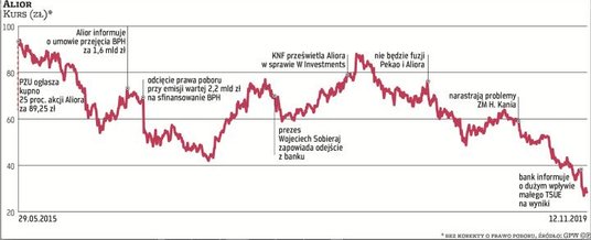 Alior jest w tym roku najsłabszym bankiem na GPW: jego notowania spadły od stycznia o 46 proc. w porównaniu z zaledwie 4 proc. przeceny indeksu WIG-banki. Dzisiaj za walory tego ósmego co do wielkości kredytodawcy w Polsce płaci się 28,4 zł (kapitalizacja 3,7 mld zł), kilka dni temu kurs ustanowił historyczny dołek na poziomie 26,96 zł.