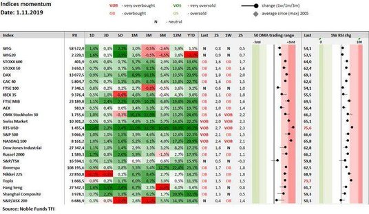 Ryszard Miodoński, dyrektora ds. strategii akcyjnych w Noble Funds TFI, przedstawił za pośrednictwem firmowych mediów społecznościowych zestawienie podsumowujące formę najważniejszych światowych indeksów giełdowych (stan na 01.11.2019). Jak możemy zobaczyć na tej grafice, zarówno w ujęciu krótkoterminowych (tygodniowym lub miesięcznym), jak i dłuższym (np. 12-miesięcznym) to był dobry czas dla rynków akcji – we wszystkich badanych okresach dominowały dodatnie stopy zwrotu.