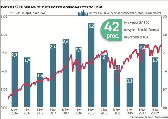 Ci analitycy, którzy zakładają dalsze zwyżki na amerykańskich giełdach, zazwyczaj sądzą, że gospodarka USA jest w lepszej kondycji, niż obawiano się jeszcze kilka miesięcy temu, i że nie grozi jej na razie recesja. Analitycy JPMorgan Chase twierdzą, że liczone przez nich wskaźniki koniunktury po raz pierwszy od pół roku sugerują skoordynowane ożywienie gospodarcze na świecie. To, wraz ze złagodzeniem amerykańsko-chińskiej wojny handlowej oraz 23 cięciami stóp procentowych spodziewanymi na całym świecie w czwartym kwartale, powinno się przyczynić do poprawy wyników spółek.