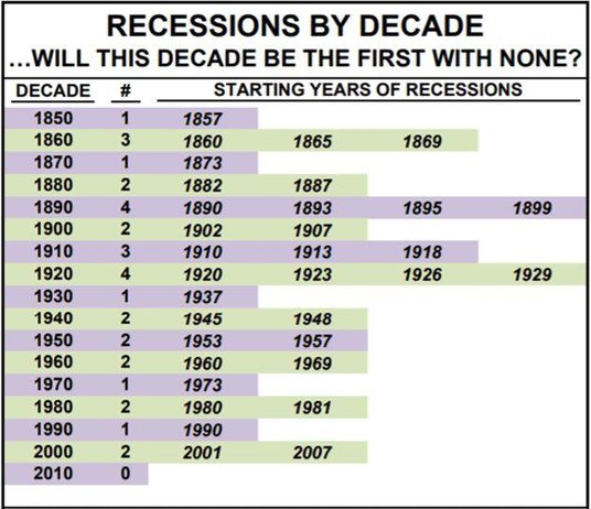 Grafikę na ten temat zaprezentował w mediach społecznościowych Chris Bailey z Financial Orbit. Wizualizacja przedstawia lata, w których rozpoczynały się recesje – są one uszeregowane według następujących po sobie dekad. Początkiem zestawienia jest rok 1857, kiedy to po raz pierwszy mieliśmy załamanie gospodarcze o globalnym zasięgu (początek miał miejsce w USA, gdzie po okresie szybkiego wzrostu gospodarczego, do którego przyczyniła się intensywna ekspansja kredytowa, w 1857 r. nastąpiło załamanie gospodarki).