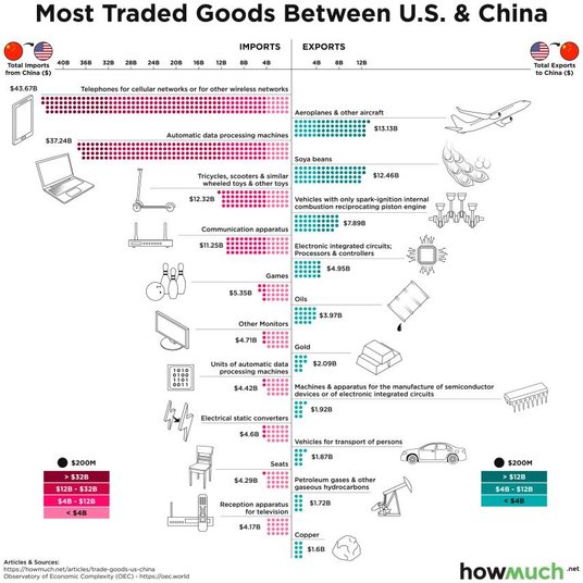 Ponowne postawienie w centrum globalnej uwagi wojny handlowej sprawia, że warto przypomnieć wzajemne zależności handlowe (i ich skalę) między Stanami Zjednoczonymi i Chinami. Klarownie przedstawia to grafika przygotowana przez portal howmuch.net. Na tej wizualizacji widzimy towary, które stanowią największą wartość w wymianie handlowej między dwoma mocarstwami. Do USA najwięcej importuje się telefonów (import USA z Chin przedstawiony jest po lewej stronie grafiki). Z kolei największą wartość eksportu Amerykanów do Państwa Środka stanowią samoloty (eksport USA do Chin widzimy po prawej stronie grafiki).