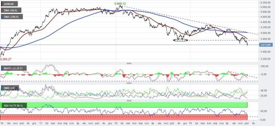 Dzisiejsze minimum indeksu średnich spółek oznacza kontynuację bessy, która trwa od początku ubiegłego roku. W ciągu 21 miesięcy indeks stracił już 30 proc. Patrząc od strony technicznej mWIG40 prezentuje się znacznie gorzej niż WIG20 i sWIG80. Pierwszemu brakuje bowiem do tegorocznego dołka jeszcze 3,5 proc., a drugiemu 6,3 proc. Warto zwrócić uwagę, że tydzień temu indeks średniaków pokonał ważne wsparcie 3750 pkt, wyznaczone przez formację podwójnego dna z końcówki 2018 r. W tym samym czasie MACD zakręcił w dół, podobnie jak RSI(14). I choć oba wskaźniki są już nisko, to do lokalnych dołków jeszcze im trochę brakuje. Stąd wniosek, że dzisiejsze minimum może zostać pogłębione. Najbliższych wsparć można szukać w okolicy 3500 pkt, natomiast oporem staje się poziom 3750 pkt.