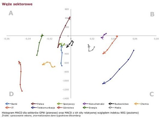 Tradycyjnie warto przypomnieć interpretację „sektorowych węży". Przedstawiona macierz pozwala na monitorowanie technicznej atrakcyjności poszczególnych branż na GPW. Na grafice „sektorowe węże" obrazują, jak zmieniała się atrakcyjność danego sektora w ciągu ostatnich pięciu tygodni. Jeśli wąż wyjdzie z pola D do pola A, to wtedy generowany jest techniczny sygnał kupna dla danego indeksu sektorowego. Z kolei przejście węża z pola A do B oznacza, że dany indeks sektorowy jest relatywnie silniejszy od indeksu WIG, co dodatkowo zwiększa atrakcyjność danego sektora. Przejście węża z pola B do C oznacza, że generowany jest sygnał sprzedaży (sektor ten jest już wykupiony i notowania zaczynają spadać). A przejście węża z pola z C do D oznacza, że spadający sektor jest dodatkowo słabszy niż indeks WIG.