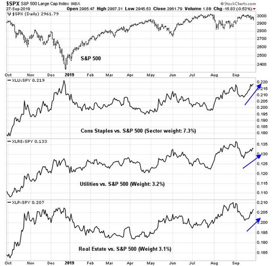 Cam Hui, który stale dostarcza inwestycyjne ciekawostki na Twitterze, zauważył, że w ostatnim czasie kilka sektorów uważanych za defensywne zachowuje się lepiej niż cały indeks S&P 500. Ekspert pokazał na wykresach, że trzy branże (Utilities – sektor użyteczności publicznej, Consumer Staples – producenci i dystrybutorzy dóbr podstawowych, Real Estate – szeroko rozumiane nieruchomości) w ostatnich tygodniach są w lepszej formie niż S&P 500. Mimo że ekspert skoncentrował się na bardzo krótkim terminie, to warto także zauważyć, że te trzy sektory pokazują wyraźnie swoją siłę od maja.
