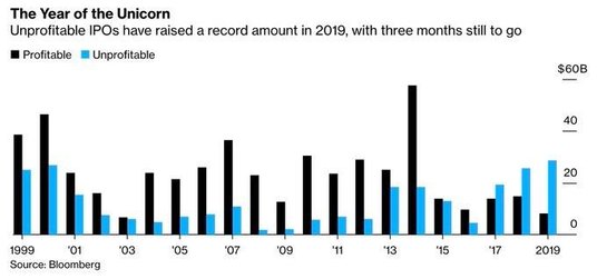 Holger Zschaepitz, dziennikarz giełdowy z niemieckiego „Die Welt", tym razem przedstawił wykres przygotowany przez agencję Bloomberga dotyczący nierentownych firm zbierających kapitał poprzez przeprowadzanie IPO. Wartość pozyskanych środków w drodze emisji publicznej akcji przez przedsiębiorstwa nieprzynoszące zysków jest w 2019 r. większa niż podczas tzw. bańki internetowej na przełomie wieków. Dodatkowo w oczy rzuca się dość duża dysproporcja między giełdowymi debiutantami przynoszącymi zysk a tymi mającymi starty.