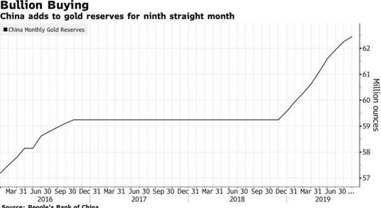 Zschaepitz wspomniał w powyższym tweecie także o kolejnych zakupach złota przez Chiny. I to właśnie tej informacji poświęcony będzie poniedziałkowy #WykresDnia, ponieważ dynamika wzrostu chińskich rezerw złota imponuje – to już dziewiąty miesiąc z rzędu, gdy dokupowano złoto. Według ostatnich, sierpniowych danych Chiny miały 62,45 mln uncji czystego złota – to blisko 5 proc. więcej niż pod koniec 2018 r. (59,56 mln uncji). Wcześniej – przez 2017 r., jak prawie cały 2018 r. – chińskie władze nie nabywały tego szlachetnego kruszcu.