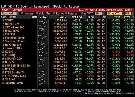 Dziennikarz giełdowy z niemieckiego „Die Welt" Holger Zschaepitz, jak często ma w zwyczaju, rozpoczął dzień od przeglądu wydarzeń na azjatyckich giełdach. W przedstawionym zestawieniu najważniejszych indeksów giełdowych w Azji dominował kolor zielony. Zschaepitz zwrócił uwagę w swoim tweecie, że powrót inwestorów do bardziej ryzykownych aktywów („Risk On") jest spowodowany przede wszystkim informacją o planach oficjalnego wznowienia negocjacji handlowych USA i Chin na początku października.
