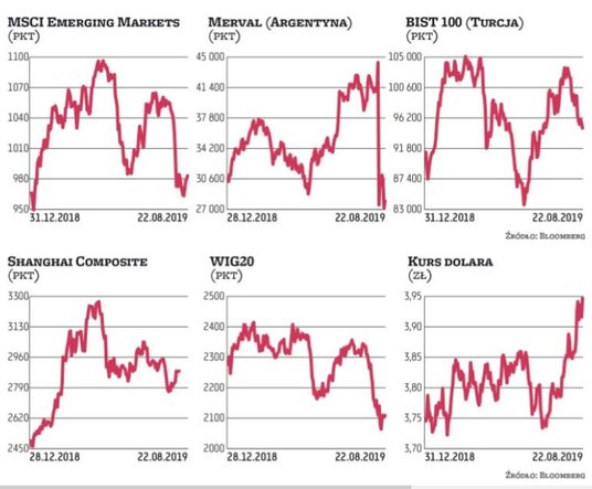 Sierpień przyniósł spektakularną przecenę argentyńskiego indeksu Merval, który stracił ponad 30 proc. (Przecena ta była spowodowana jednak przede wszystkim czynnikami krajowymi związanymi ze zbliżającymi się wyborami prezydenckimi, które może przegrać obecny prezydent Maurcio Macri). Od początku roku Merval spadł o 7,6 proc. Niewiele mniejszej przeceny doznał w tym roku WIG 20 (-7,3 proc. do czwartkowego popołudnia). Kiepsko sobie radziły w tym czasie też np. koreański indeks KOSPI (-4,4 proc.), Hang Seng – główny indeks pogrążonego w protestach Hongkongu (0,8 proc.) – czy też węgierski BUX (1,5 proc.). Indyjski Sensex, choć na przełomie maja i czerwca ustanawiał rekordy, to od tego momentu spadł o ponad 5 proc. i w czwartek był tylko o 1,6 proc. wyżej niż na początku roku.