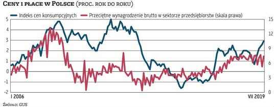Dotąd większość ekonomistów zakładała, że dynamika płac ustabilizuje się w pobliży 7 proc. Lipcową, niewielką niespodziankę trudno uznać za niespójną z tym scenariuszem. Zbiegła się ona jednak w czasie z przyspieszającą inflacją. W lipcu indeks cen konsumpcyjnych (CPI), główna miara inflacji w Polsce, wzrósł o 2,9 proc. rok do roku, najbardziej od października 2013 r. I na tym prawdopodobnie się nie skończy. Większość ekonomistów uważa, że po kilku miesiącach stabilizacji inflacja znów przyspieszy, a na początku 2020 r. może znaleźć się w okolicy 4 proc. rocznie. Czy to może nasilić żądania płacowe pracowników, prowadząc do szybszego wzrostu wynagrodzeń i – w konsekwencji – jeszcze wyższej inflacji?