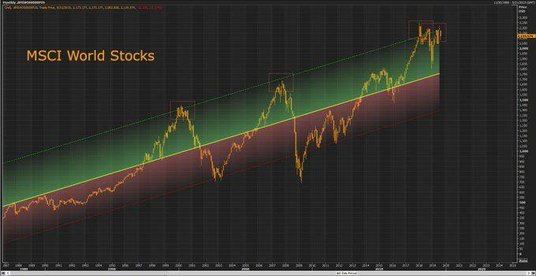 Popularny użytkownik Twittera, mający ponad 24 tys. obserwujących Alastair Williamson zaprezentował wykres MSCI World Stocks, który jego zdaniem utknął w martwym przy górnej linii kanału wzrostowego. Williamson na wykresie zaznaczył także poprzednie tego typu sytuacje, które ostatecznie kończyły się mocną przeceną – było tak m.in. w okresie przed kryzysem finansowym w latach 2007-2009.