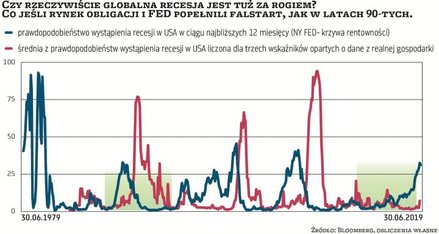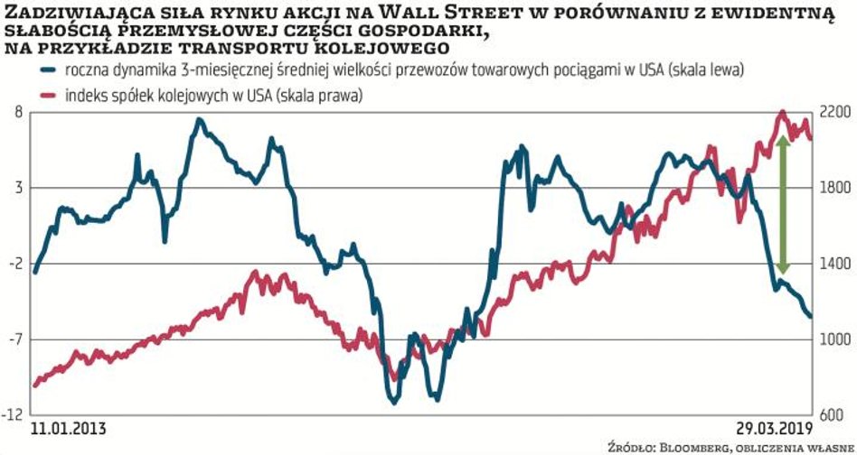 Tak duży i szybki (trzy sesje) spadek zdarza się na Wall Street bardzo rzadko (choć w ubiegłym roku pojawił się aż dwukrotnie). Choć obecne nastawienie inwestorów do rynków akcji jest znacznie ostrożniejsze niż w trakcie trwającej niecały miesiąc euforii ze stycznia 2018 roku, to trzeba zauważyć, że lipiec przyniósł największą od tamtego okresu liczbę sesji, które zakończyły się ustanowieniem rekordów przez S&P 500 (8 na 22 sesje, a w styczniu 2018 roku 14 sesji). Wagę tegorocznych dokonań podkreśla fakt, że historyczne maksima osiągał zarówno reprezentujący spółki technologiczne indeks Nasdaq, jak też przemysłowy indeks Dow Jones. To drugie jest o tyle dziwne (ale i budujące zarazem), że sektor przemysłowy amerykańskiej gospodarki przeżywa w tym roku ciężkie chwile. W podobnych fundamentalnych tarapatach znalazł się w tym roku sektor transportu kolejowego w USA. Zanotował on prawie 5-proc. załamanie w przewozie towarów, nieco tylko mniejsze od tego z zapaści z 2015 roku. Jednak cztery lata temu indeks przewoźników kolejowych w USA spadł o 40 proc., natomiast w tym roku, z ponad 30-proc. wzrostem, bije nawet spółki technologiczne (wykres 1). Niewiele słabszym wzrostem wycen giełdowych spółek może się w tym roku pochwalić branża deweloperska w Stanach Zjednoczonych. Pomimo ewidentnej (trwającej od kilku kwartałów) słabości w inwestycjach mieszkaniowych indeks spółek z tego sektora znalazł się ostatnio na najwyższym poziomie od półtora roku.