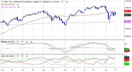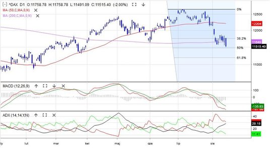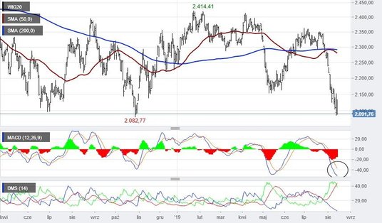 Indeks dużych spółek z GPW dzieli 10 pkt od minimum z 2018 r. Jeśli pokona ten dystans, to otworzy sobie drogę do okrągłych 2000 pkt. Na ten moment przewaga niedźwiedzi nie podlega dyskusji. Linia –DI oddala się w górę od +DI, a ADX zwyżkuje. Ponadto średnia krocząca z 50 sesji zwróciła się już na południe, a 200-sesyjna jest tego manewru coraz bliższa. Warto zwrócić uwagę, że MACD jest na poziomie najniższym od przełomu 2015/2016 r., gdy WIG20 testował 1650 pkt. To pokazuje silne wyprzedanie rynku, dając nadzieje chociaż na wzrostową korektę. Najbliższe wsparcie/opór to 2082 pkt i 2150 pkt.
