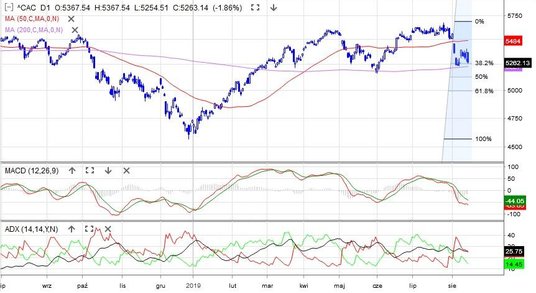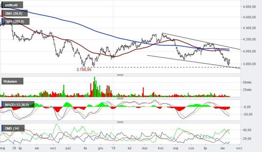 Indeks warszawskich średniaków spadał po południu o 1,6 proc. do 3800 pkt. Od początku kwietnia na wykresie zarysowuje się spadkowy kanał. Celem niedźwiedzi wydaje się poziom podwójnego dna z okresu październik-listopad 2018 r. Mowa o okolicy 3755 pkt. Bliskość ważnego wsparcia jest argumentem za odbiciem, zwłaszcza, że MACD wyhamował spadki. Jeśli jednak wskazane wsparcie pęknie, będzie to sygnał do kontynuacji przeceny. Najbliższy opór to 3860 pkt.