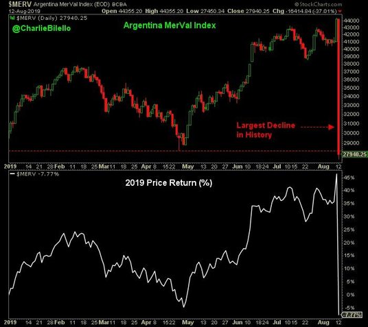 Wszystko za sprawą gigantycznych spadków, które obserwowali inwestorzy w Argentynie. Merval – główny indeks argentyńskiej giełdy – stracił w jeden dzień blisko 38 proc. Jeszcze bardziej poraża, gdy weźmiemy pod uwagę tenże indeks wyrażony w dolarach – w tym ujęciu zanurkował on 48 proc. Był to największy w historii jednodniowy spadek w Argentynie (poprzedni rekord miał miejsce w 2002 r. – wtedy Merval w dolarach został przeceniony o 45,2 proc.), a także jest to drugi najgorszy wynik w historii na świecie. Jak dotąd niechlubnym liderem jest indeks ze Sri Lanki, który w 1989 r. stracił w jeden dzień 61,7 proc. swojej wartości.