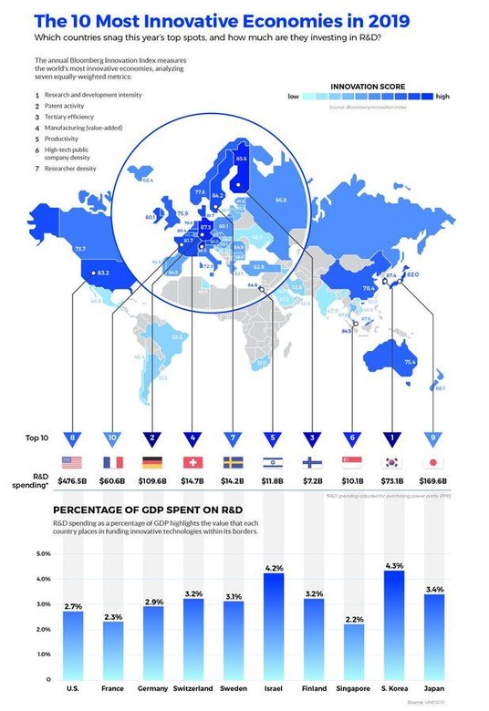 Na pierwszej grafice – poza wartościami uzyskanymi w Bloomberg Innovation Index – do przedstawienia skali innowacyjności państw użyto także kolorów. Im dany kraj jest bardziej innowacyjny, tym jego kolor jest bardziej niebieski (różnice szczególnie dobrze widać w przypadku sąsiadów Polski – Niemiec i Ukrainy). Za najbardziej innowacyjny kraj została uznana Korea Południowa, a na podium znaleźli się także Niemcy i Finowie.