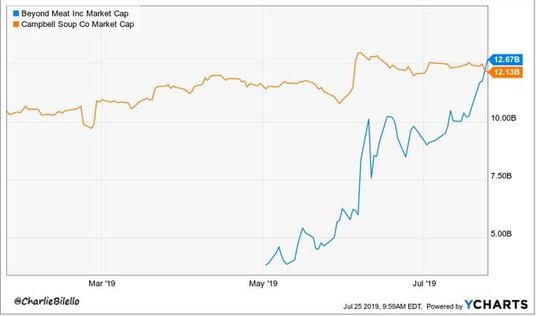 Jedną z takich spółek był Campbell Soup, czyli amerykański producent zup w puszkach, sosów i innych produktów spożywczych. Charlie Bilello w swoim tweecie przypomniał, że Campbell Soup powstał w 1869 roku, ma 23 tys. pracowników i przychody rzędu 10,5 mld USD. Dla porównania Beyond Meat to firma z 2009 r., z 383 pracownikami i przychodami na poziomie 95 mln USD. Mimo tych dużych dysproporcji to teraz producent wegańskich burgerów ma większą kapitalizację.