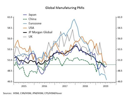 Szczególnie niepokoi jednak sytuacja w dłuższym horyzoncie. Podsumowała to m.in. Julia Coronado z MacroPolicy Perspectives, która przedstawiła wykres pokazujący, jak od 2015 roku zmieniała się wartość wskaźników PMI dla przemysłu w poszczególnych krajach i regionach. Dodatkowo na grafice widzimy globalny PMI, który jest przygotowywany przez JP Morgan. Globalny PMI na wykresie zaznaczony jest linią czarną – i faktycznie perspektywy dla przemysłu na świecie rysują się w czarnych barwach.