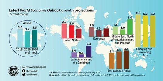 Dzisiejszy wykres przedstawia prognozy dla globalnej gospodarki, zarówno w ujęciu ogólnym, jak i z podziałem na poszczególne obszary. W przypadku przewidywań dla światowej gospodarki, Międzynarodowy Fundusz Walutowy spodziewa się wzrostu na poziomie 3,2 proc. w 2019 r. oraz 3,5 proc. w 2020 r. Obie prognozy są gorsze niż w przypadku predykcji z kwietnia, gdzie np. wzrost globalny na 2019 r. był szacowany na 3,3 proc. Jak podkreślają autorzy szacunków, globalnej gospodarce nadal szkodzą czynniki polityczne, tj. wojna handlowa między USA i Chinami, czy ciągły chaos związany z brexitem.