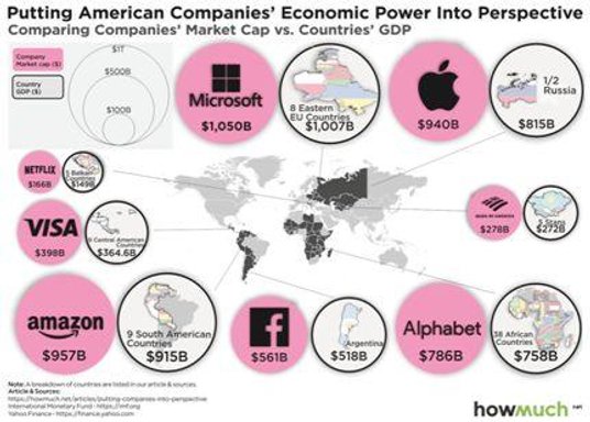W konsekwencji długoletniej hossy na amerykańskim rynku akcji wiele spółek ze Stanów Zjednoczonych posiada obecnie większą kapitalizację niż wartość produktu krajowego brutto wielu państw na świecie. Dlatego popularny portal internetowy postanowił porównać rynkową wartość giełdowych przedsiębiorstw z USA z PKB krajów (lub grupami krajów). Tworząc grafikę, wykorzystano kapitalizację z 8 lipca oraz dane z Międzynarodowego Funduszu Walutowego.