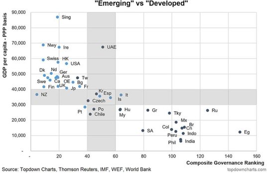 Jak widzimy na wykresie, większość krajów gospodarek rozwiniętych znajduje się w górnej części wykresu, po lewej stronie. To pokazuje, że są to znacznie zamożniejsze kraje z dużo lepszą „jakością administracji", niż ma to miejsce w przypadku krajów gospodarek rozwijających się.