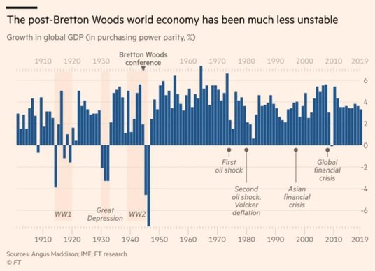 Zaprezentowany wykres przedstawia wzrost gospodarczy wyrażony jako PKB (według parytetu siły nabywczej). Jak widzimy na grafice, od czasu ustaleń z Bretton Woods, światowa gospodarka stała się bardziej stabilna.