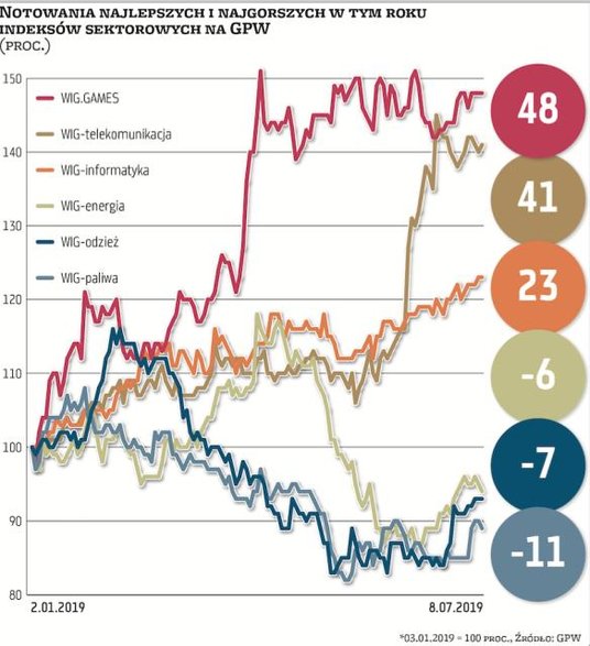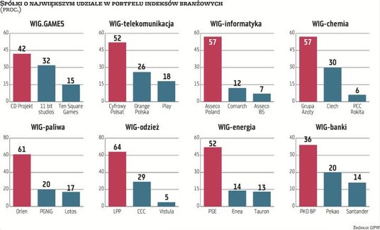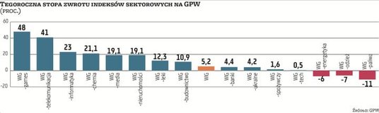 Absolutnym rekordzistą jest WIG-games, utworzony w marcu tego roku indeks grupujący producentów gier, który w tym roku urósł aż o 48 proc. Zdominowany jest przez trzy spółki – CD Projekt (42 proc. udziału w portfelu), 11bit studios (31 proc.) i Ten Square Games (15 proc.). Każda z nich jest na fali wznoszącej – CD Projekt zyskał od początku roku 50 proc. i ustanowił nowe historyczne maksima, a wspomniane dwie spółki urosły jeszcze bardziej, bo po 63 proc. Mocno zyskały także dwie mające mniejszy udział w portfelu firmy, czyli CI Games i PlayWay – odpowiednio 18 proc. i 40 proc. Zyskują też inne firmy z branży, co pokazuje, że moda na nią się utrzymuje.