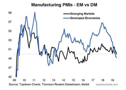 „Topdown Charts" w swoich cyklicznych propozycjach wykresów tygodnia, zaprezentował m.in. grafikę pokazującą indeks PMI dla przemysłu rynków rozwiniętych (ang. Developed Markets, skrót DM) w porównaniu z tym samym wskaźnikiem dla rynków rozwijających się (ang. Emerging Markets, skrót EM).