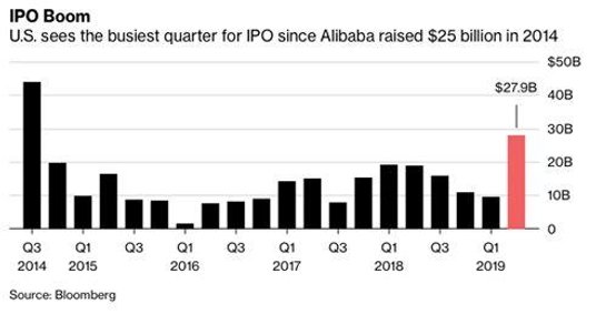 Dobry okres na rynku IPO w USA podsumowały w swoim artykule dziennikarki Bloomberga (Crystal Tse, Liana Baker) i jak podkreśliły, miniony kwartał był najlepszy na rynku IPO od czasu debiutu Alibaby we wrześniu 2014 r. (zobrazowały to także na przedstawionej grafice).