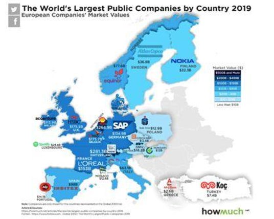 Portal „howmuch.net" przygotował grafikę o największych spółkach na świecie z podziałem na kraje. W tym materiale postanowiliśmy bliżej przyjrzeć się Europie i liderom naszego kontynentu. Na grafice widzimy, że w konturach poszczególnych państw umieszczone zostały logotypy krajowych spółek o największej giełdowej kapitalizacji. O wielkości wartości rynkowej mówi nam m.in. kolor na jaki zabarwiony jest poszczególny kraj – im ciemniejszy, tym większa wartość spółki.