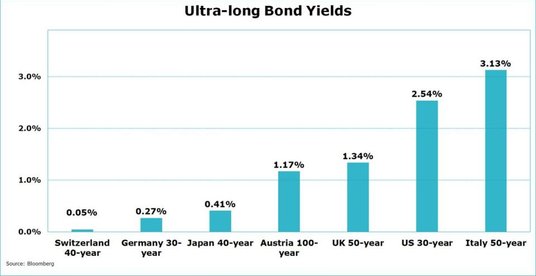 Przyjrzyjmy się rentowności przedstawionych na wykresie papierów dłużnych emitowanych przez konkretne kraje. Najatrakcyjniejszy kupon oferują Włosi za swoje 50-letnie obligacje. Z uwagi na stosunkowo duże ryzyko inwestycyjne w tym kraju nikogo specjalnie nie dziwi, że to właśnie Włochy kuszą największymi odsetkami. Na drugim biegunie jest Szwajcaria, która za swoje 50-letnie obligacje (na grafice jest podane, że 40-letnie) wypłaca odsetki poniżej 0,1 proc.